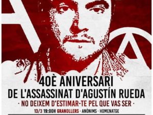 Enguany se celebren els actes conmemoratius del 40 aniversari de l'assassinat del militant anarquista i antifranquista Agustín Rueda Sierra. Aquest divendres comptarem amb la presència d'amigues i familiars per a la presentació de l'homenatge.